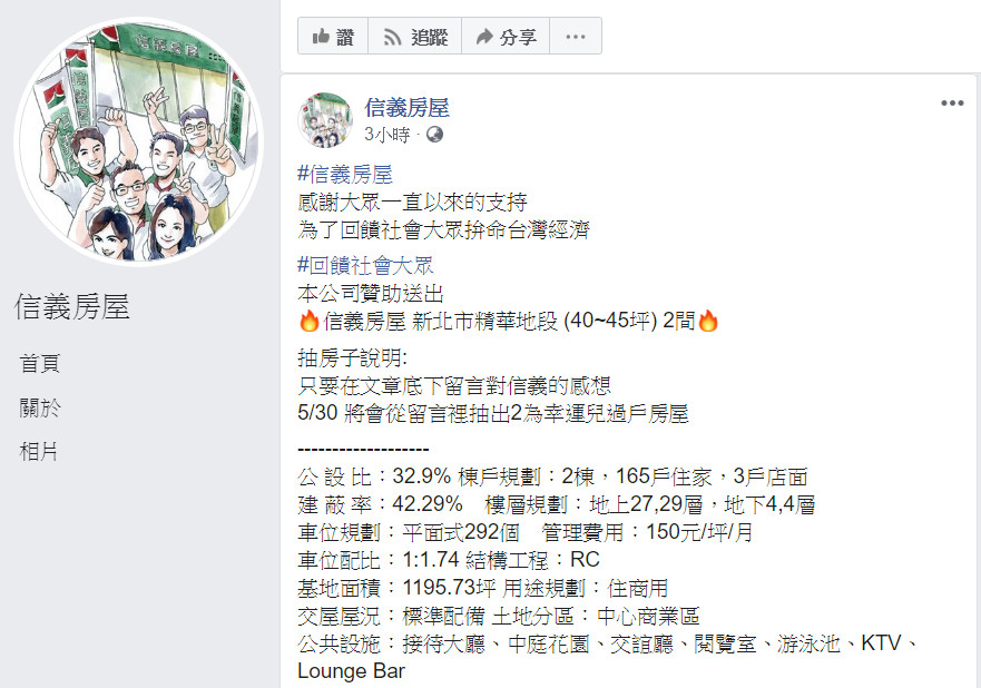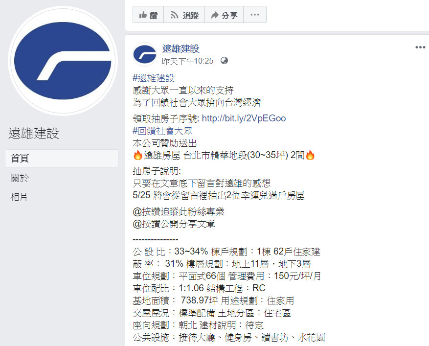 ▼這些臉書假粉專會假冒「遠雄建設」、「信義房屋」,還附上房屋詳細資料,甚至連建蔽率、車位規劃、車位配比、基地面積、屋況及公設都有,一不小心就會信以為真。