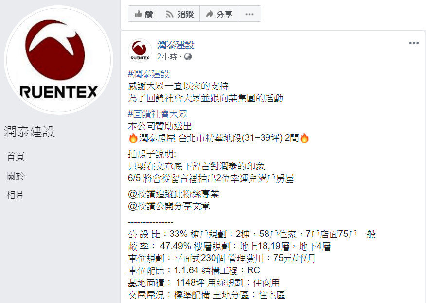 ▼他們發文表示「為了回饋社會大眾一直以來的支持,將贊助送出雙北精華地段房屋2間,只要在活動貼文底下留言寫下感想,就會從中抽出2位幸運兒」,引起許多網友心動,紛紛留言造成洗版臉書動態牆。