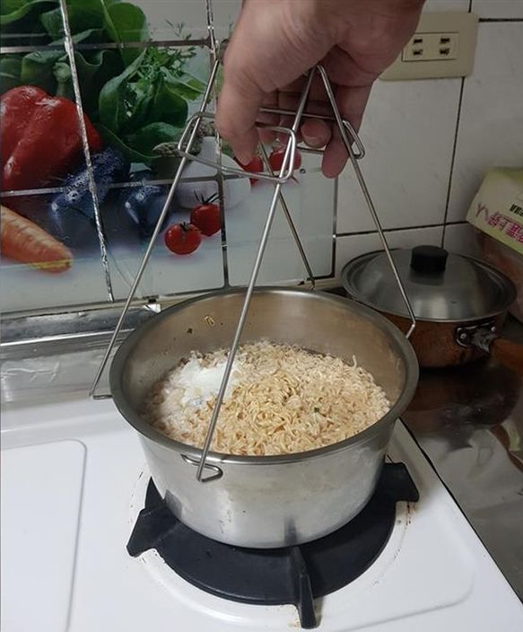 ▼照片可見一鍋煮好的泡麵還放在瓦斯爐上,原PO拿著防燙夾準備夾起鍋子,擔心會翻倒泡麵的原PO在貼文寫道:「有人跟我一樣,煮完泡麵使用這個工具要端上桌子時,都有感覺到很大的壓力嗎?」