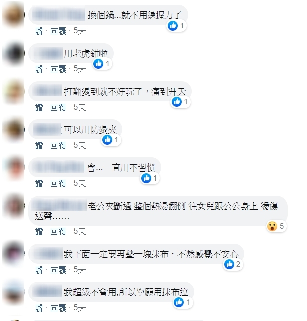 ▼貼文一出,許多網友都哀號,「原來不是只有我會怕這樣拿喔」、「我都夾超緊!到桌上手都快抽筋」、「很可怕!」、「我家也有這個工具」、「翻鍋2次後就沒再怕了!現在只要煮好泡麵我都直接在瓦斯台上吃」、「壓力大到無法使用,還是抹布萬能啊」、「我也超有壓力!一定要拿東西墊底」。