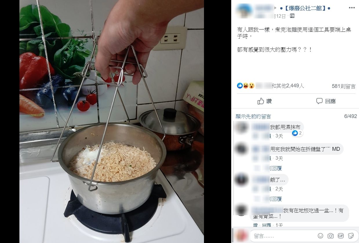 近日有一名網友在Facebook社團「爆廢公社二館」發文表示,在家煮完泡麵,拿出「防燙夾」準備把熱鍋端上桌時,都會有種莫名的壓力,所以上網問問大家是不是也和他一樣。