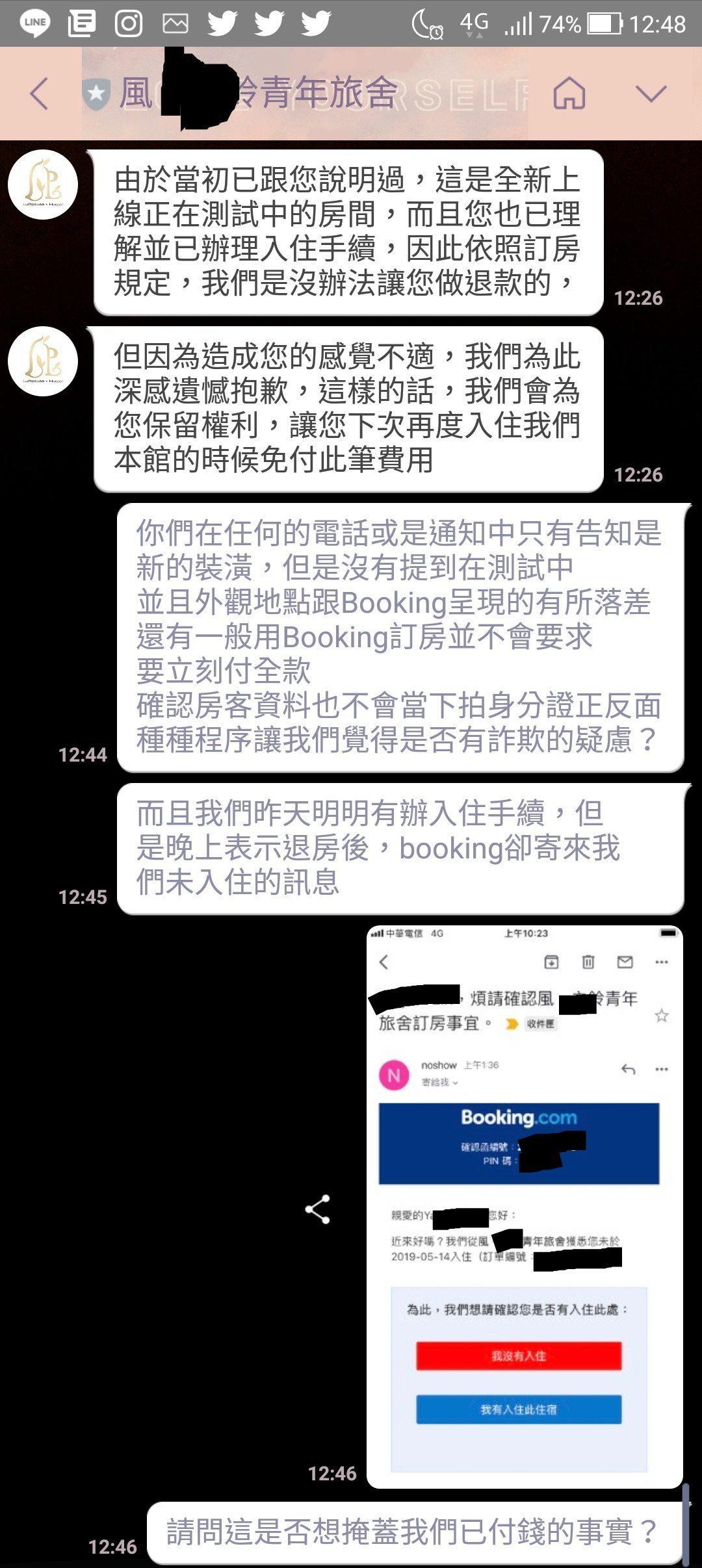 ▼之後跟負責人對質,對方居然以各種理由拒絕退錢,只表示下次可以提供免費住宿。最後她以廣告不實、網路上看到的設施跟地址都不同,入住的根本不是「本館」為由,才終於退到一晚的住宿費。