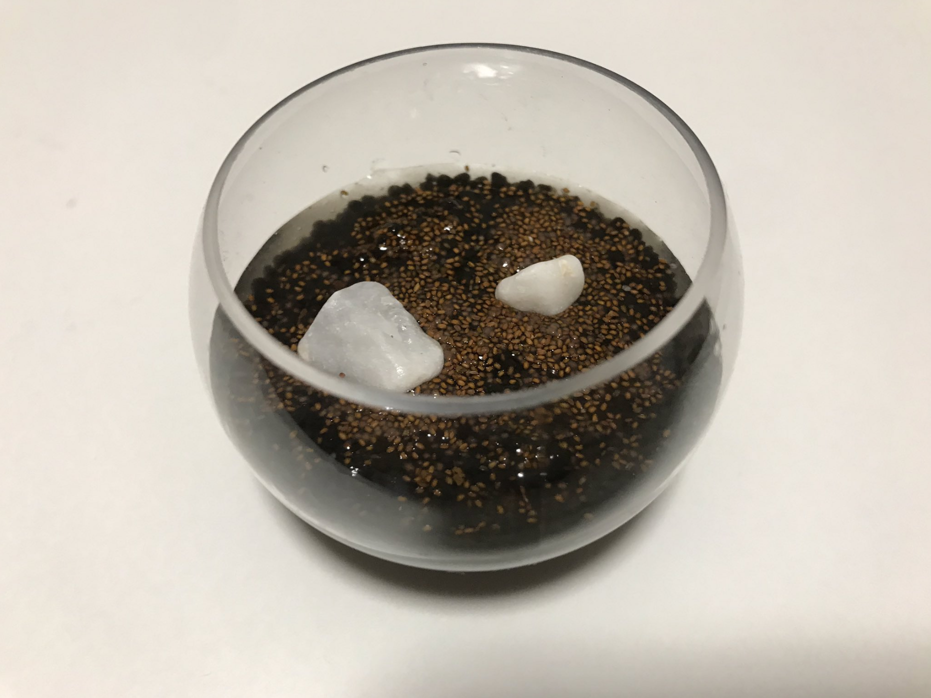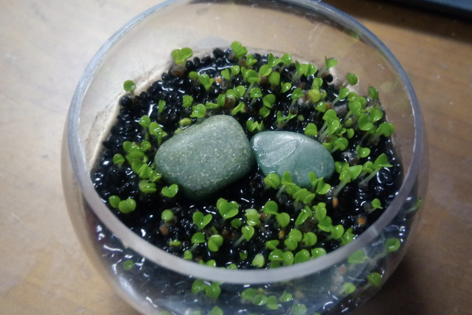 ▼依照步驟把介質、造景石、種子、水都加入之後,等待水草發芽。