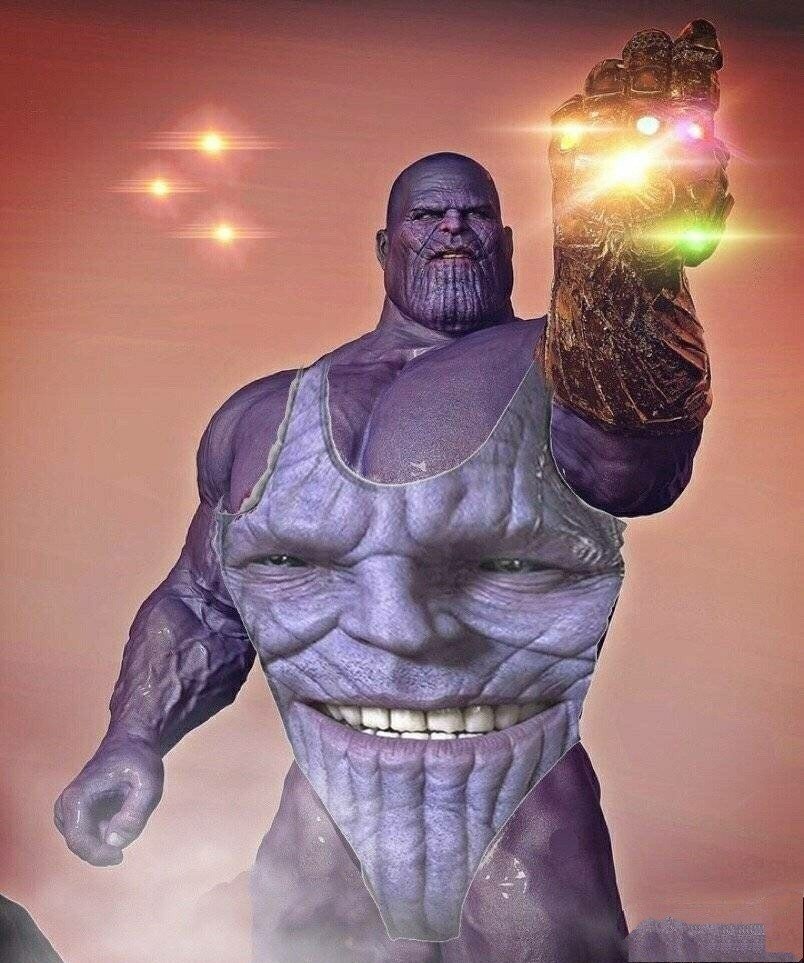 ▼而這套紫色的泳裝,薩諾斯的眼睛位於胸部的位置,潔白的牙齒在腰部的部分,而最令人尷尬的就是泳裝的下巴部分了!有網友將這件泳裝用 PS修圖的方式穿到了薩諾斯的身上,只能說這個視覺效果非常驚悚!