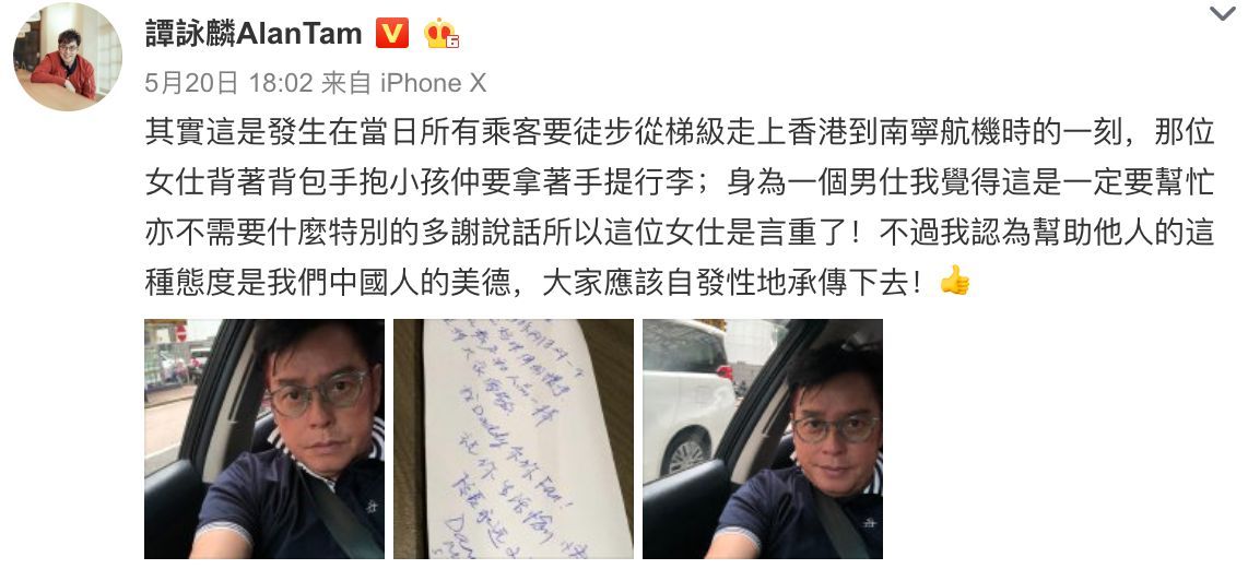▼譚詠麟看了婦人的感謝信認為她言重了,只是希望大家也可以一樣互相幫助,「我認為幫助他人的這種態度是我們中國人的美德,大家應該自發性地承傳下去!」
