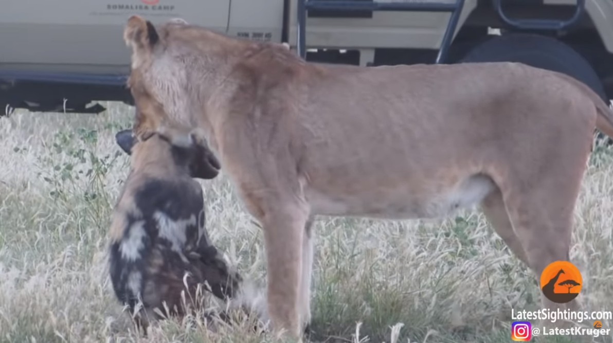 2019年05月29日日前在非洲南部辛巴威的萬基國家公園(Hwange National Park)中發生了一件令人大開眼界的大自然「鬥智」畫面,這隻非洲野犬在被母獅咬著時,竟然假裝不再掙扎,等到母獅鬆懈後瞬間逃命,讓剛好目睹這一切的遊客們都被嚇得目瞪口呆!