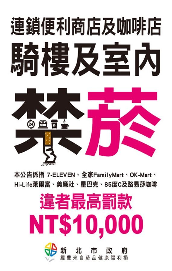 ▼新北市在今年4月發布公告,規定連鎖便利商店(7-11、全家、OK、萊爾福、美聯社)和咖啡店(星巴克、85度C、路易莎職人咖啡)的騎樓都將實施禁菸,宣導期持續6個月,將於2019年9月1日起正式開罰。
