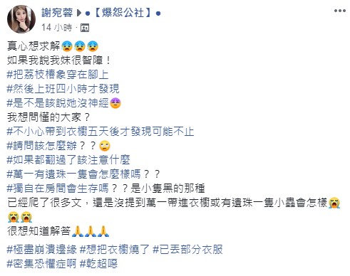 ▼原po在臉書社團《爆怨公社》中po文表示,「如果我說我妹很智障!把荔枝椿象穿在腳上,然後上班四小時才發現,是不是該說她沒神經?」從照片中可以看到,10幾顆蟲卵都附在襪子內側,而且有些還有孵化的現象!