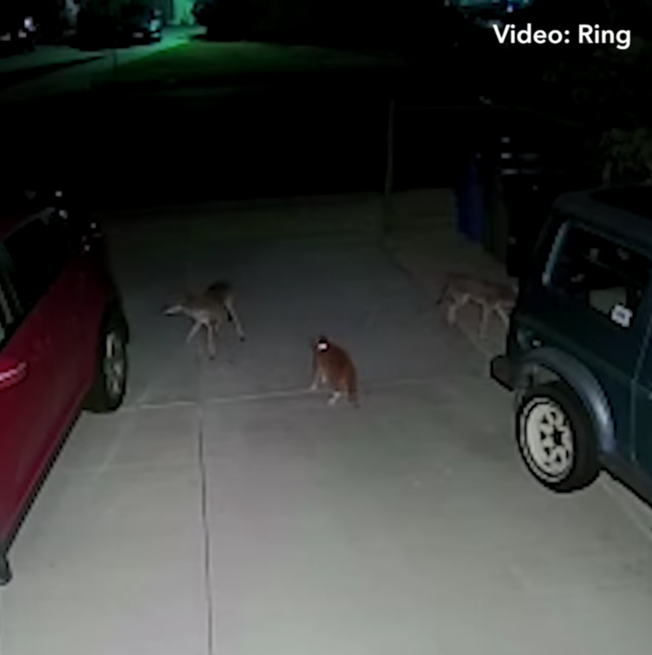 2019年06月01日美國一隻16歲橘貓寶刀未老!居住在洛杉磯的Beth Hayes在半夜突然被移動探測器驚喜,一開始還以為是是有賊在門口,沒想到打開手機竟然驚見愛貓被2匹飢腸轆轆的郊狼盯上!但是,下一秒她竟然看到愛貓發威的畫面!