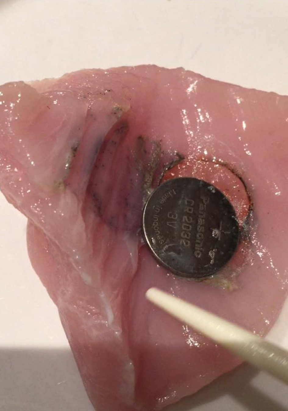 悚!小孩誤吞鈕扣型電池後果嚴重 生雞肉實測「半小時烙出黑印」