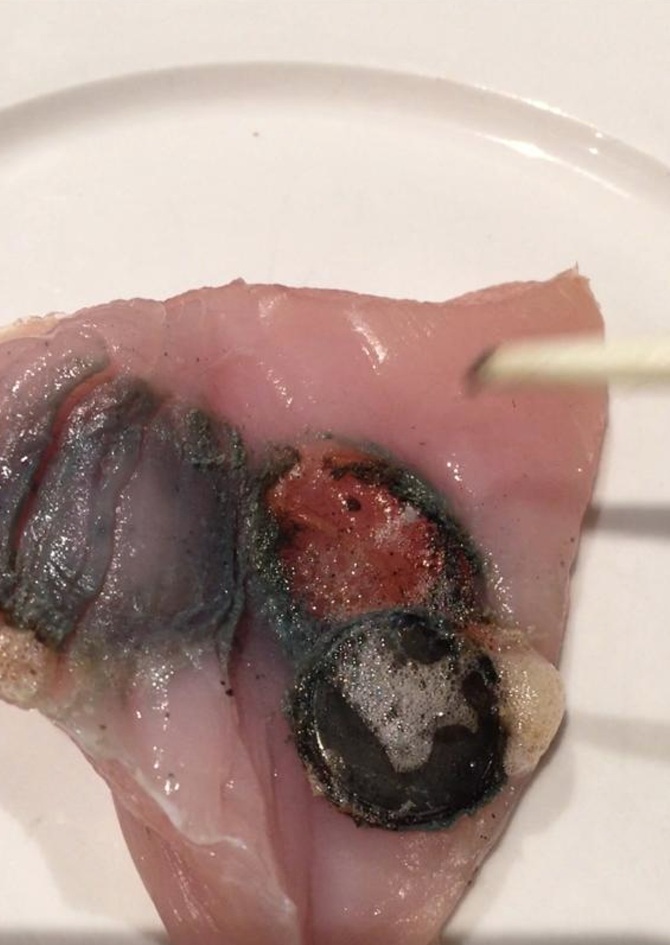 ▼澳洲兒童急救課程機構(CPR Kids)為了讓家長有所警惕,他們用生雞肉來模擬人體放上鈕扣電池,30分鐘後…雞肉就出現焦痕!