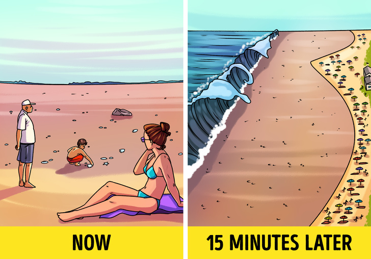 當海岸上曾有水拍打過的痕跡,但海浪又退得很遠時,代表可能有海嘯的徵兆。2004年南亞大海嘯時,很多人沒注意到這個現象,反而開心地去撿海岸上露出來的貝殼和魚。那時海灘上只有2個人知道危險將至:一個是10歲的英國女孩Tilly Smith,和一名生物老師 John Chroston,他們急著奔走警告大眾,挽救了許多人的生命。