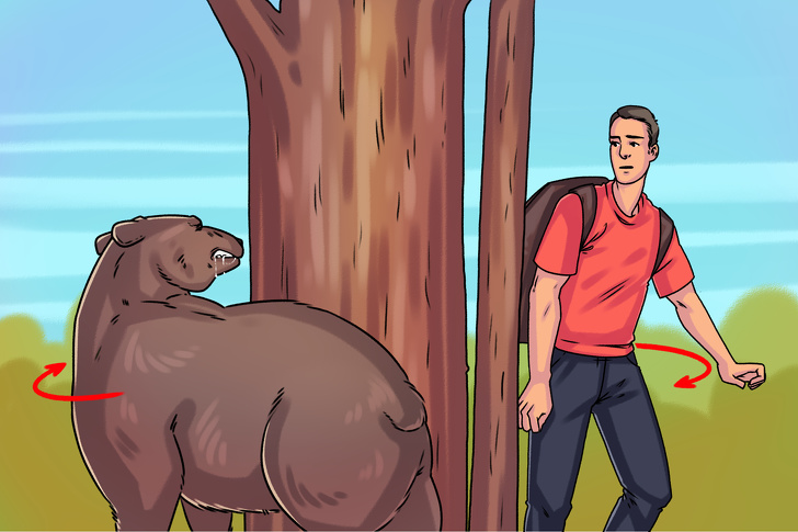 在遇到熊的時候,也記住不要驚慌。如果牠只是站著不動,靜靜看著你,很可能只是在困惑,因為牠根本搞不清楚你是誰,也無法猜測你要做什麼行動。如果牠緩慢向你靠近,你也可以緩慢往後退。大部份時候,當熊意識到你是個人類,都會選擇退縮。