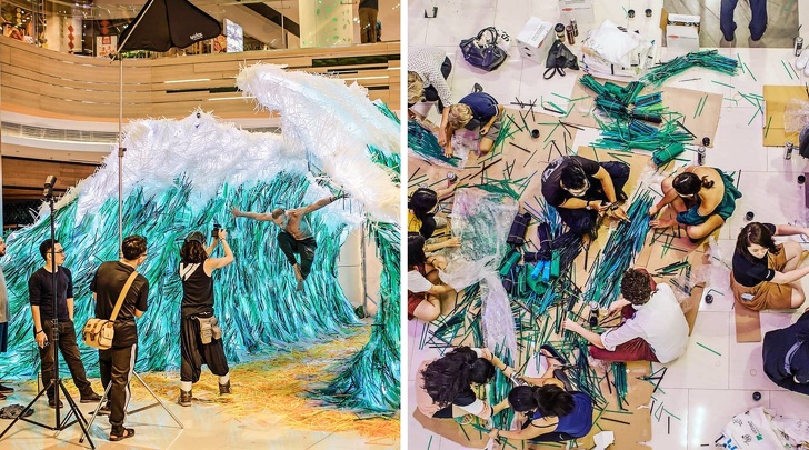 ▼為了完成這個作品,他們在6個月內收集了超過16萬根塑膠吸管,這些吸管按照顏色來擺放,以此來呈現出波浪的不同顏色。例如藍色、綠色、黑色的吸管被用於底部,白色的放在最上方,黃色的代表沙子。
