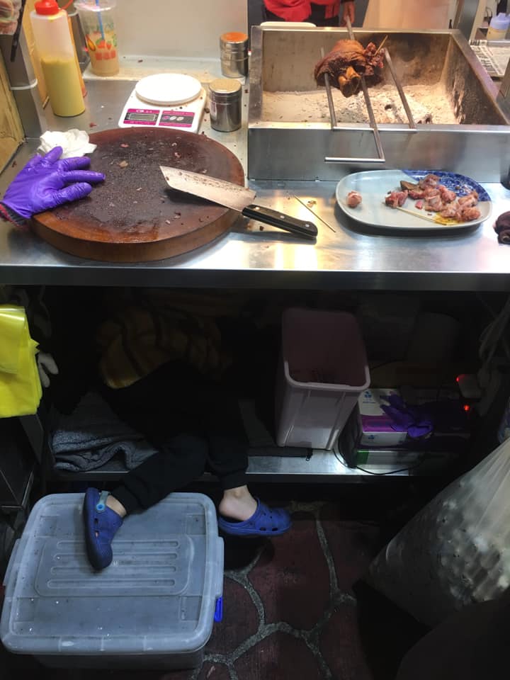 ▼另一名網友也貼出自己擺攤時,孩子在攤位底下睡覺的照片。