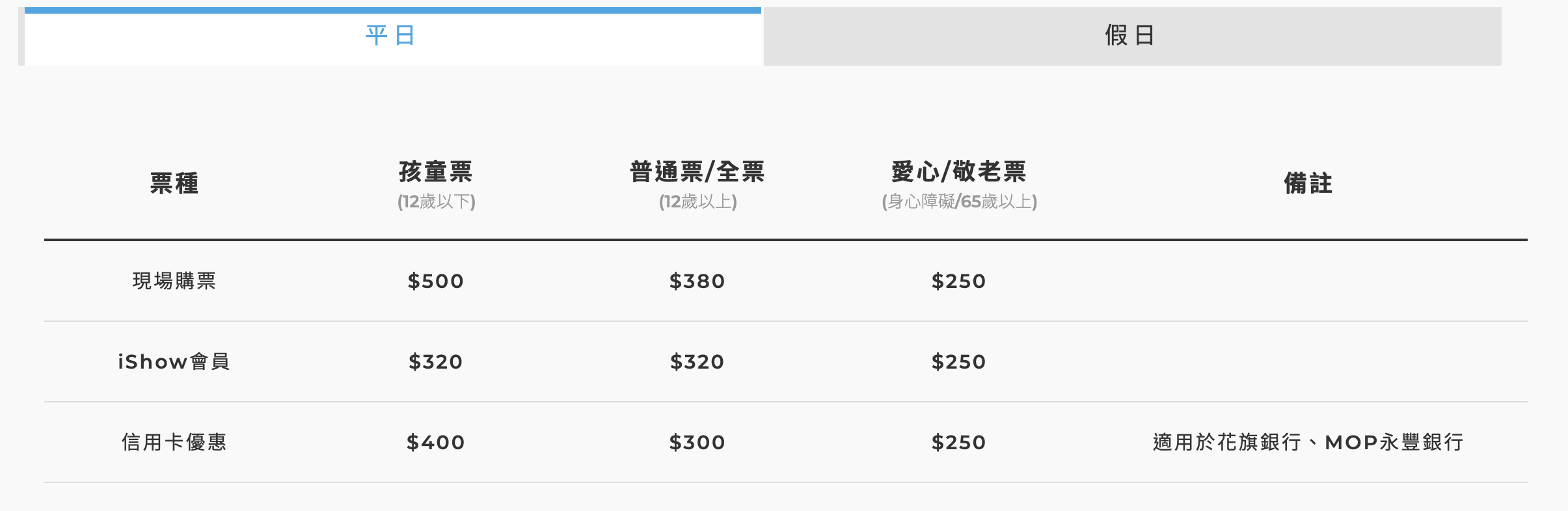▼現場購買原價票價,平日最低250元即可入場,假日則需要300元,票種分為愛心票、全票與孩童票,整體價格介於250元至600元。