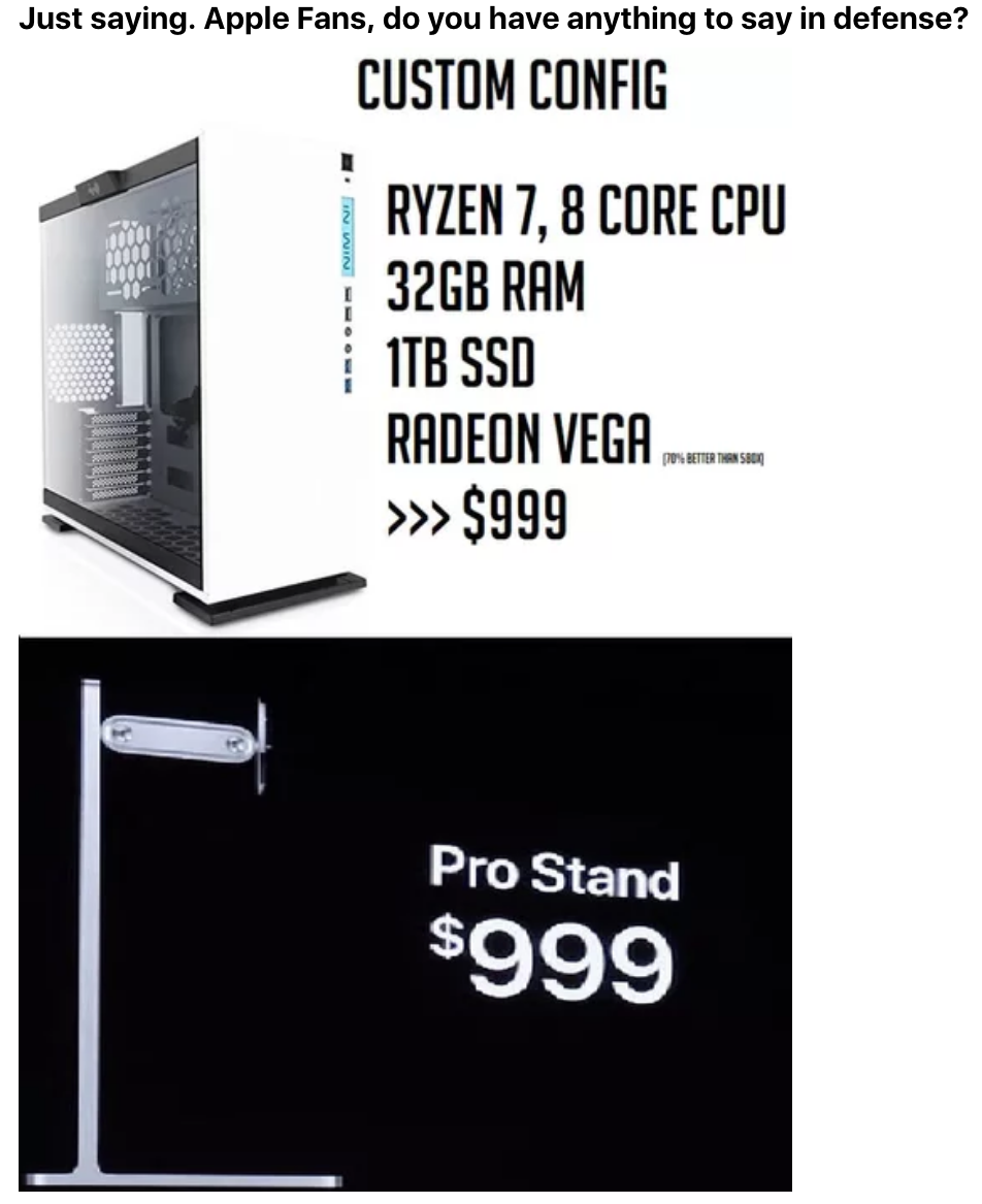 2019年06月05日蘋果產品的售價真的越來越狂!蘋果在WWDC開發者大會推出全新Mac Pro桌上型電腦和外置顯示器,但是售價卻讓外國媒體也咋舌,痛批搶錢不手軟、簡直荒謬至極!網友也忍不住自製梗圖讓大家笑一笑!