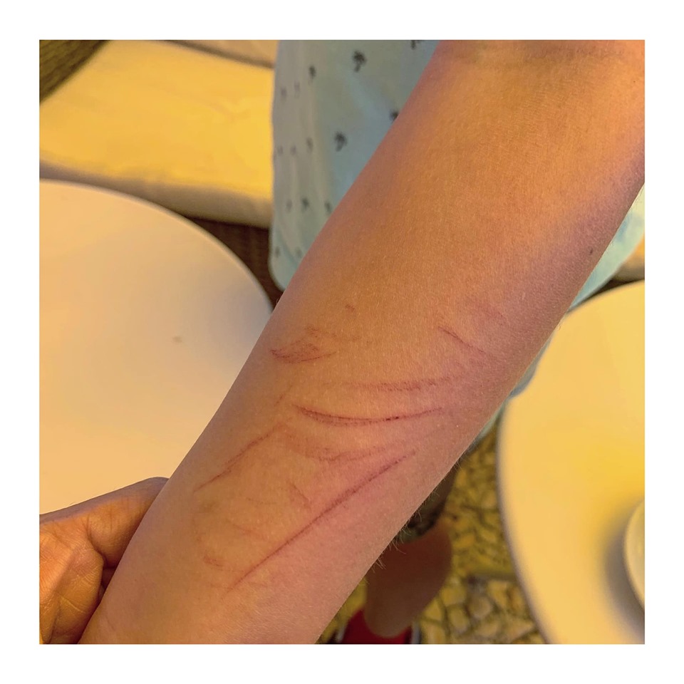 ▼媽媽表示,她發現5歲的阿弟手腳有明顯的血痕,問過後才知道,有同學用尖尖的樹枝打他。那名同學一邊揮舞樹枝一邊笑,阿弟跟他說不要打了,他還不停下。阿弟大力將那名同學推倒在地,他馬上大哭起來。