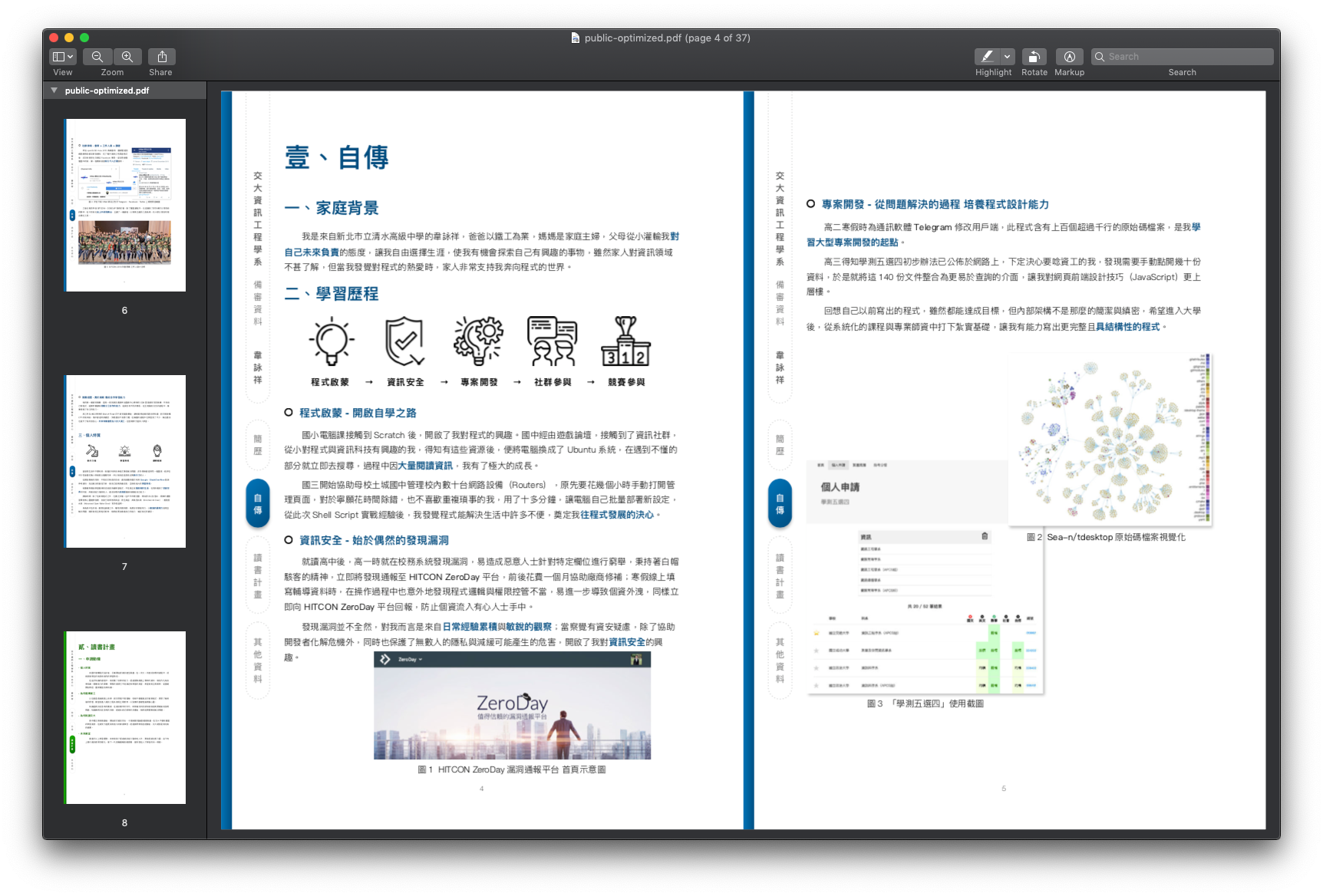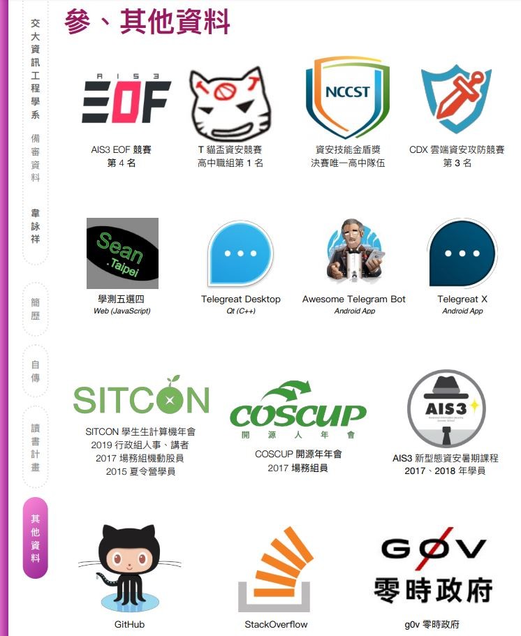 ▼韋詠祥就讀新北市清水高中,他大方公開長達37頁的備審資料,其中簡要的介紹了個人經歷與自傳,畫面清晰明瞭。雖然學測成績不到頂尖,但他對資工程式卻早有興趣。從國中起便自學程式,精熟C++、Linux、Shell和PHP,求學階段更曾幫校方處理資安問題。