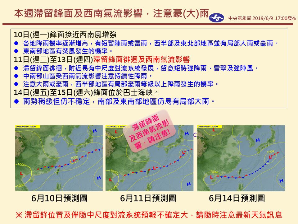 2019年06月10日端午假期,全台各地天氣都出現炎熱高溫,但好天氣隨著假期結束,也將與我們暫別一陣,接下來就要開始大變天,梅雨鋒面將會襲來,且滯留在台灣的上空,從週一起,全台將連續6天降雨,可能還會出現更具規模的降雨,西半部地區與宜蘭地區的朋友,要特別防範,中央氣象局也提醒恐有致災的可能。