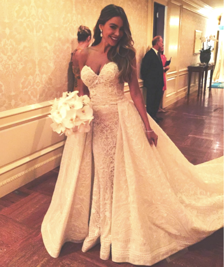 ▼來自哥倫比亞的美魔女蘇菲亞維加拉(Sofia Vergara),婚禮上穿著 Zuhair Marad 的婚紗,上面嵌了數千個耀眼的珍珠和亮片,後面的裙子還是可以拆卸的,讓她在舞蹈環節時更加方便移動。