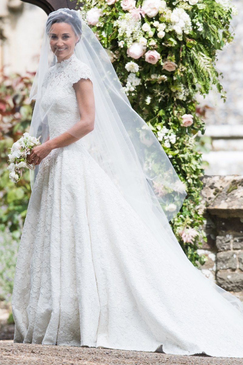 ▼由英國女設計師 Giles Deacon 所設計的婚紗,刺繡蕾絲搭配短袖緊身胸衣看起來經典和時尚並存,堪稱是名流千古的作品之一。