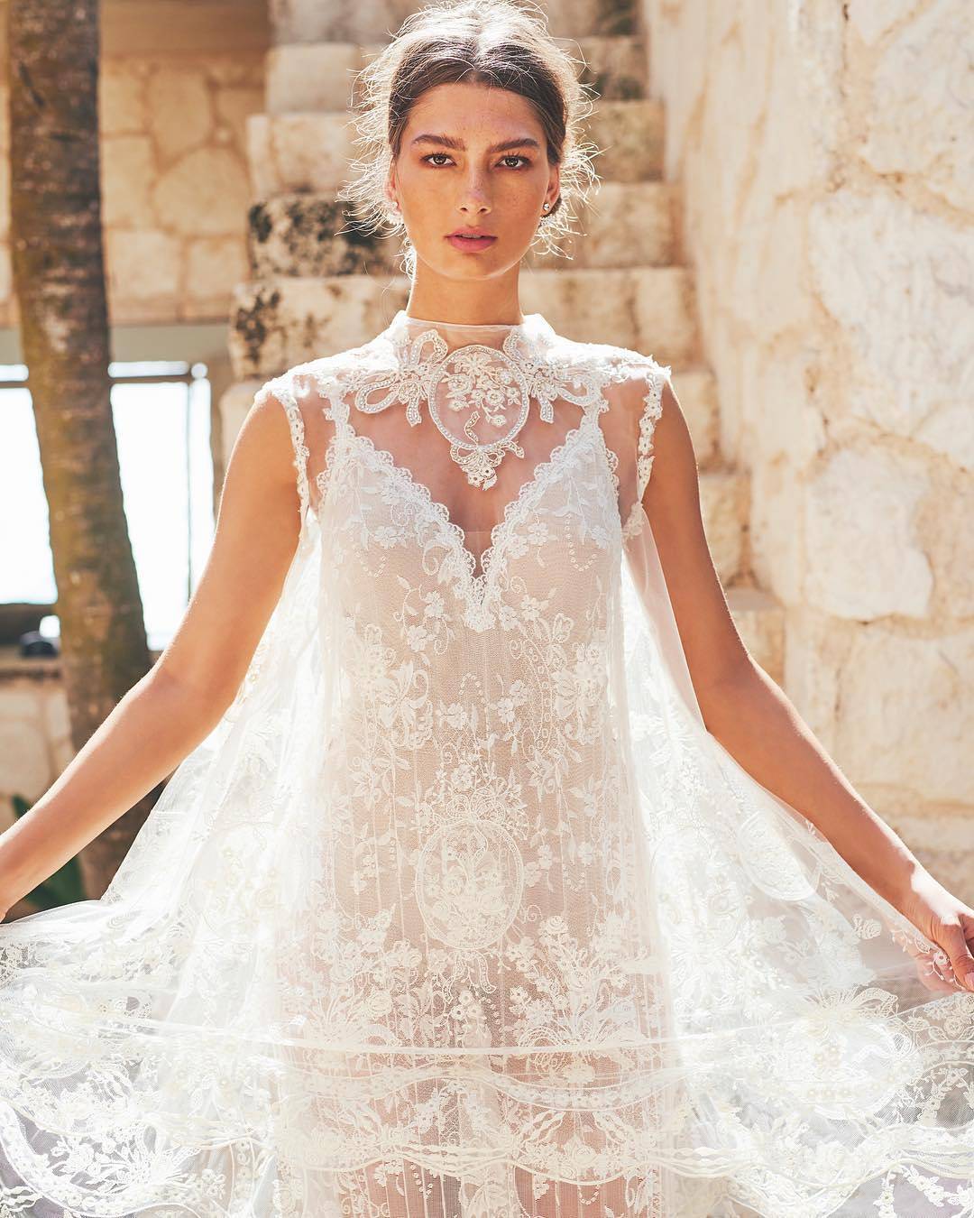 ▼以色列設計師 Galia Lahav 所設計出來的波西米亞風蕾絲連衣裙,利用超薄的刺繡來巧妙掩蓋新娘的身體,帶出了另一種神秘的美感!