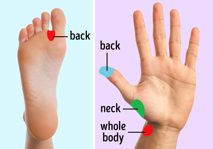 ▼1.按摩圖中手腳的穴位:簡單的穴道按摩,就能緩解身體上的大部分酸痛。閒暇時舒服躺下或坐下,深呼吸,閉上眼睛,全身放鬆,然後開始按摩這些穴位。
