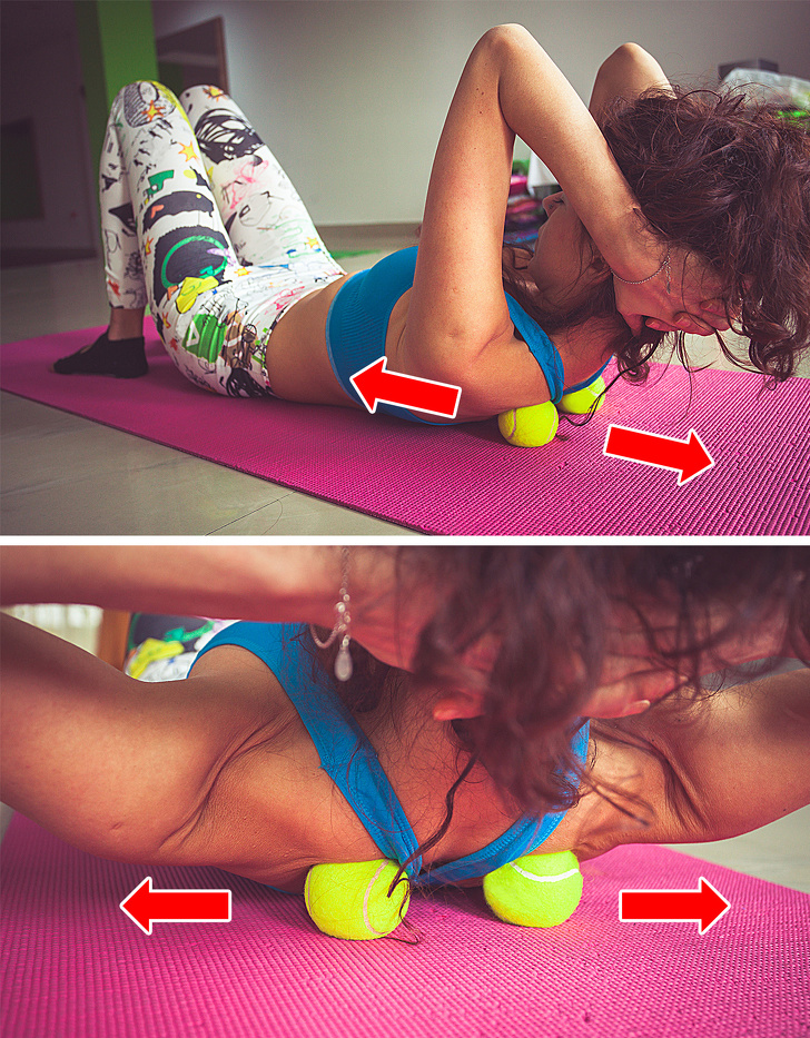 ▼2.用網球按摩:背部靠著網球躺下,雙腿併攏,雙膝彎曲,將網球放在痛點部位,輕輕上下移動,按壓60秒。