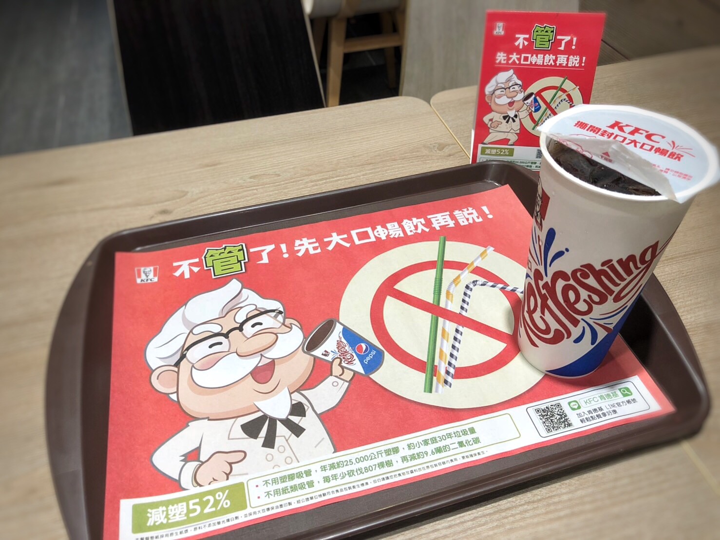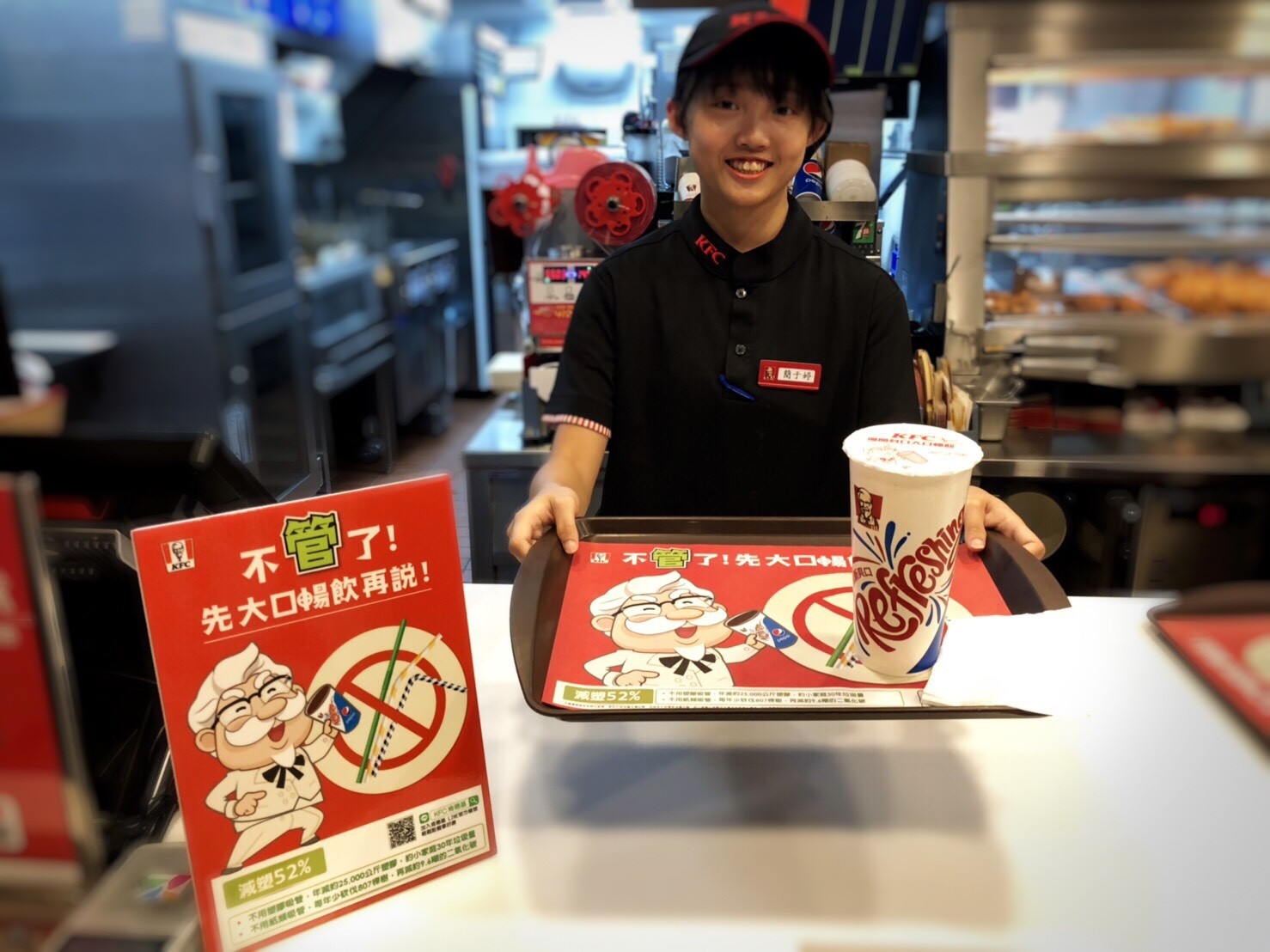 ▼肯德基比政府政策早一步推行「不『管』了!先大口暢飲」活動,全面停用塑膠吸管,預計可減少52%塑膠垃圾,每年減少的量相當於一個小家庭30年的垃圾量。