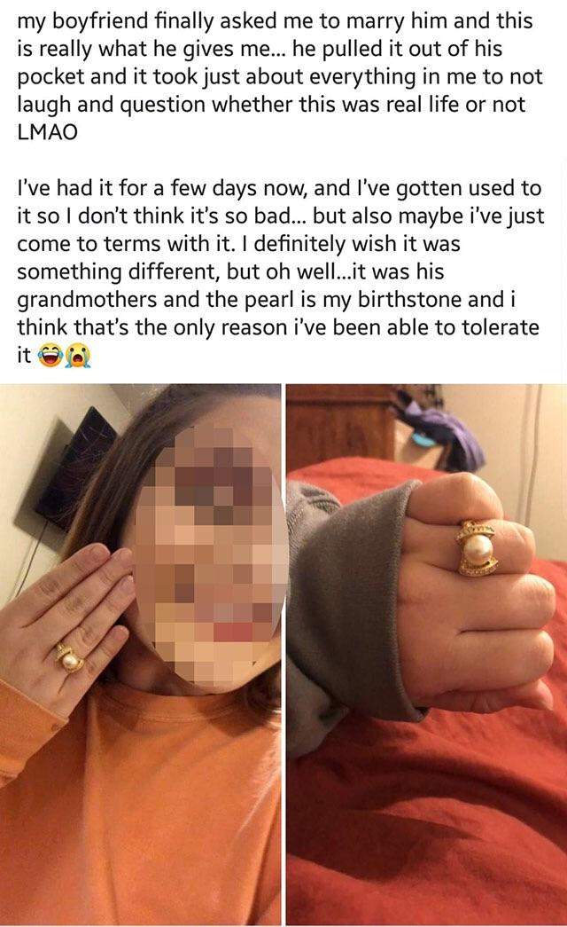 ▼外國知名論壇「Reddit」一名女網友被求婚卻不是很開心,「我的男友終於向我求婚了!但是…他真的給了我這個…我非常用力忍住才沒有笑出來,還再三問他是認真的嗎…」