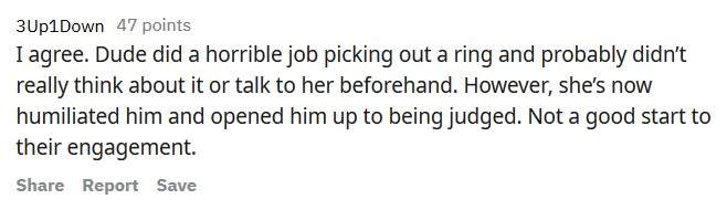 ▼「我同意這位老兄真的不會選戒指,也肯定沒有和女生談過有關於戒指的事。不論如何,女生現在這樣PO出來是很不好的行為,對兩人的婚姻關係一點好處都沒有。」