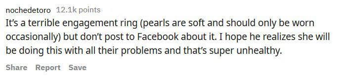 「這真的是很糟的求婚戒指(珍珠很軟,只適合偶爾拿出來戴),但是妳不需要PO出來。希望男生知道這個決定會成為日後的爭吵點,以後不管遇到什麼事都會被翻出來講就對了,這是很不健康的婚姻生活!」