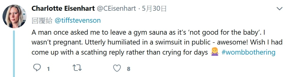 「我曾經被一個男人要求離開健身房裡的三溫暖,他對我說『這樣對胎兒不好』,然而事實卻是我根本沒有懷孕!那感受真的太糟了!」