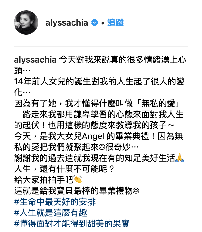 ▼賈靜雯也在臉書的文中感謝過去,才造就了她現在所擁有的美好生活,「因為無私的愛把我們凝聚起來,很奇妙」、「人生,還有什麼不可能呢?這就是給我寶貝最棒的畢業禮物!」