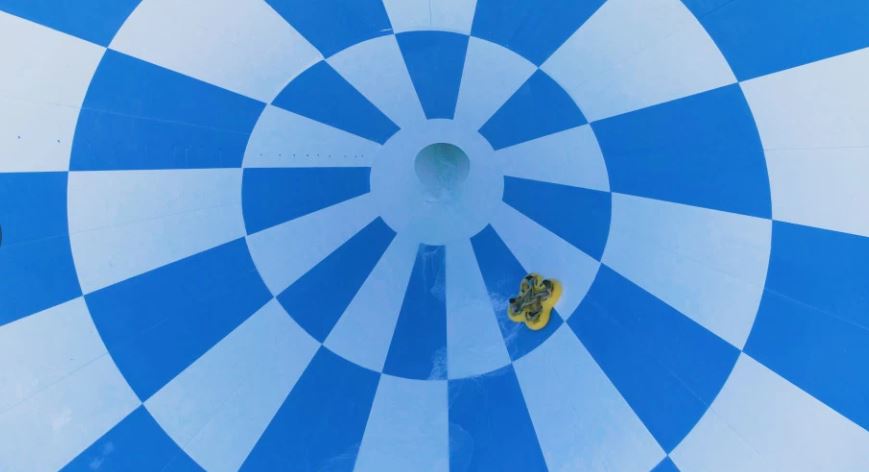 ▼經過管道向下俯衝後,接著滑到敞開的「大碗公」,遊客沿著碗公周圍45度大旋轉,體驗刺激滑水樂趣!
