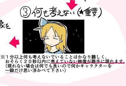 ▼接著就是非常重要的部分:讓腦袋什麼都不要想。不過保持1分鐘不思考確實不容易,通常人類在20秒之後腦中就會浮現出下意識的畫面,但如果腦袋還是一片空白的話,就隨便想著一樣東西。