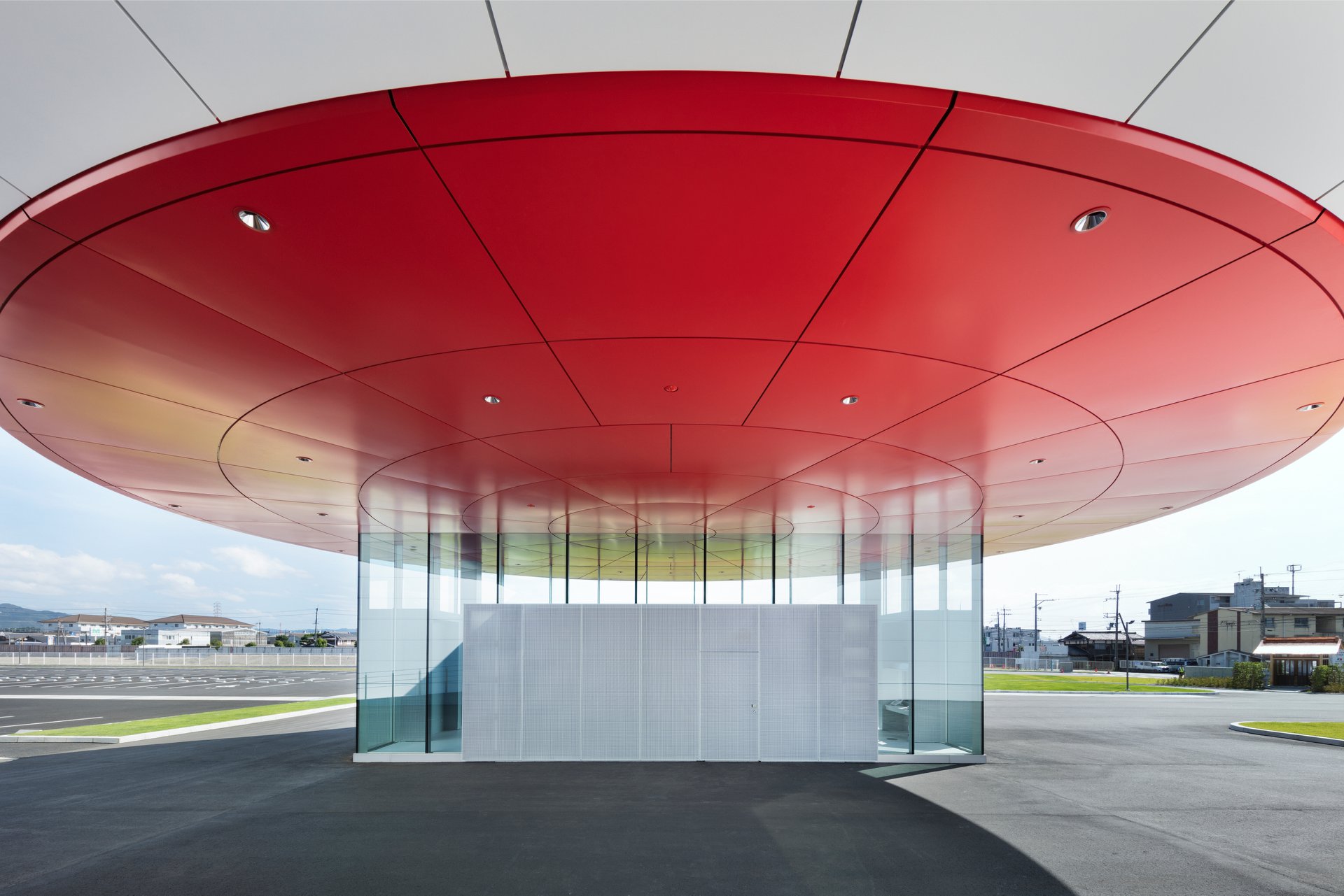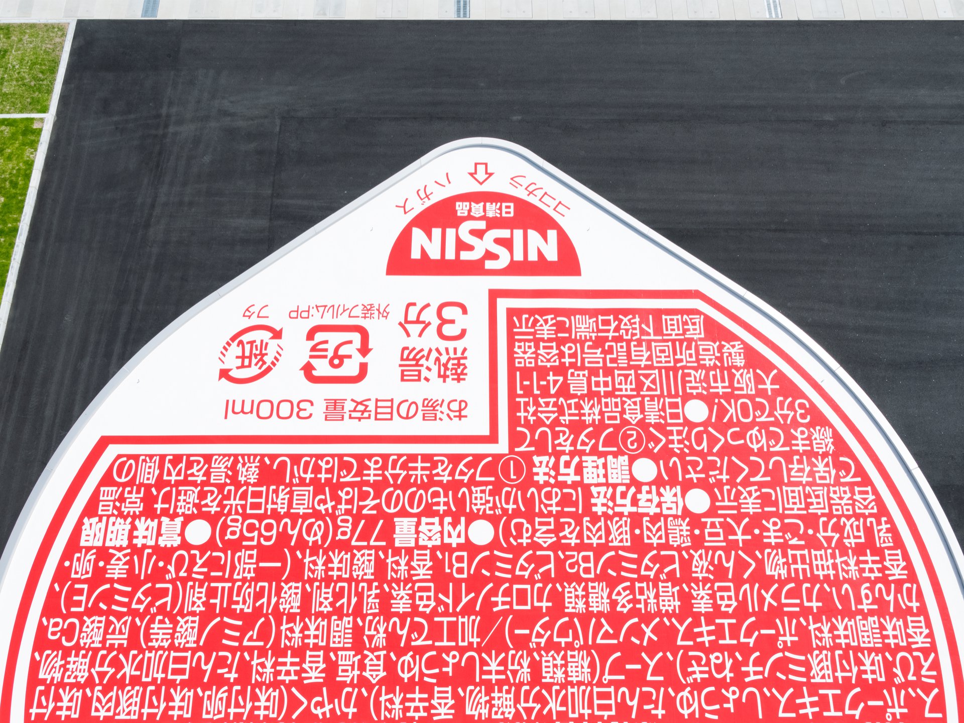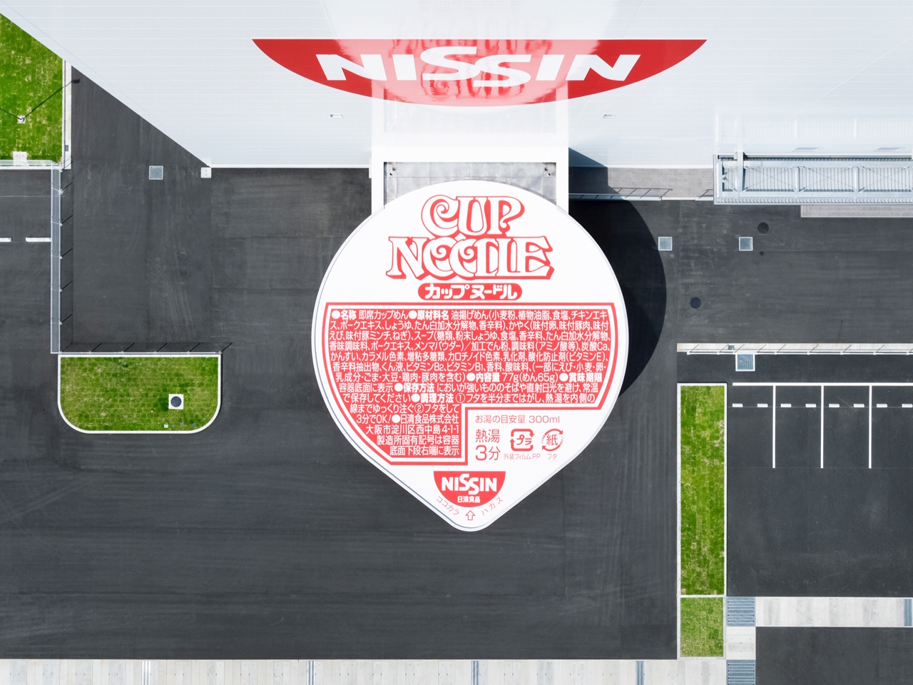 ▼這間工廠的設計者是日本著名平面設計師佐藤可士和。他將工廠入口設計成了大型杯麵揭蓋造型,屋頂上還有正常杯麵上的內容物說明呢。