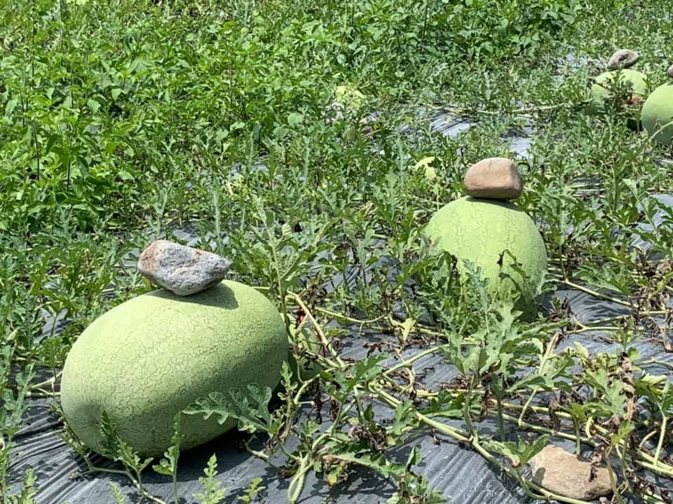 ▼這名網友在臉書《爆廢公社二館》貼出照片,表示「好美的西瓜田,知道嗎?西瓜上面為什麼要放石頭呢?今天長知識了」。