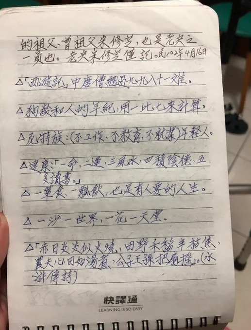 如今重視學問的態度,在現代人的身上已經越來越少見了。而爺爺卻不以自己年紀大為藉口,如此認真好學的精神,實在值得我們大家學習和借鏡!