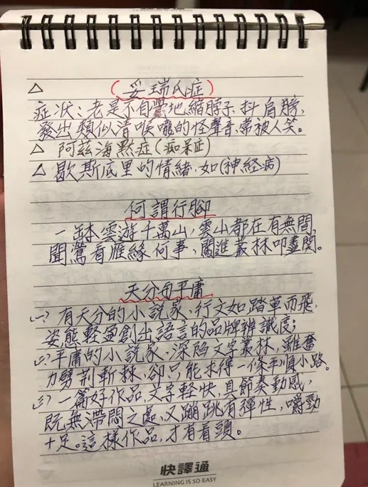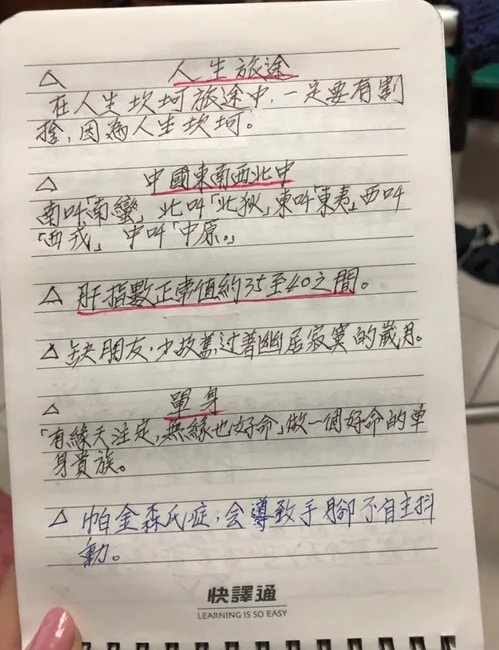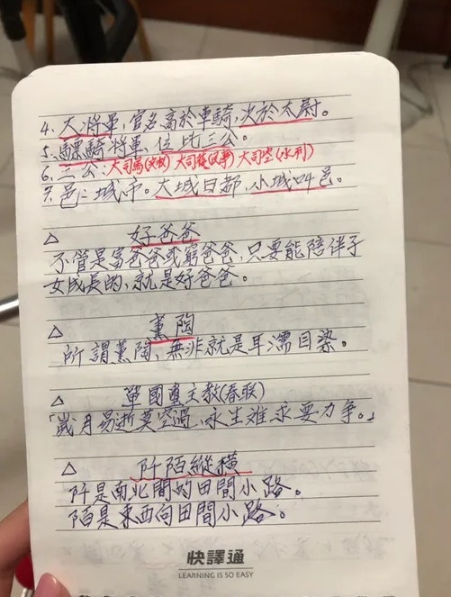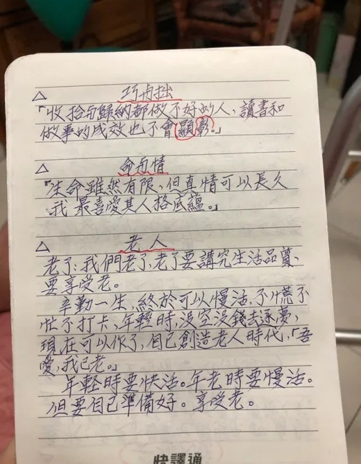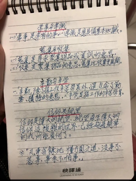 2019年06月26日想要學習新的事物,年齡從來都不應該當成藉口,活到老學到老才是正確的生活態度!近日就有一名網友在《Dcard》論壇上分享了自己80幾歲爺爺的手寫筆記,表示爺爺從小就對中文非常有興趣,即使在當兵時也會認真的看書識字。如今他雖然年事已高,每天仍然會在家裡學習各種不同領域的知識,還會將這些資料用手寫的方式記錄下來。原po將這些筆記用拍照的方式分享出來後,整齊和條理分明的筆記讓許多網友都自愧不如!