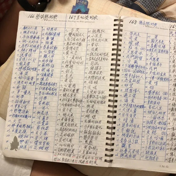 ▼爺爺甚至還會將歌手們的作品一一寫下來,看起來是不是很像 KTV 的歌單呢?