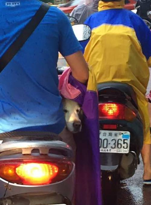 ▼但如果視線再往下看,就可以明白原因所在啦!騎士的雨衣中透出一個狗頭,這隻被把拔呵護的狗狗似乎正好奇看外面,一副「我有把拔寵~」的幸福模樣!