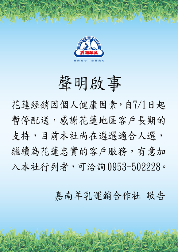 ▼隨後嘉南羊乳也發出正式公告,指出花蓮經銷商因為個人健康,暫停配送,其他地區不受影響。而公司也在遴選合適的接手人選,等到找到願意接下的經銷商,就會繼續花蓮的服務。