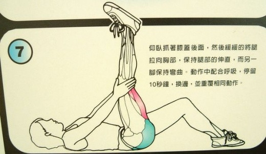 ▼7.仰臥抓著膝蓋後面,然後緩緩的將腿拉向胸部,保持腿部的伸直,而另一腳保持彎曲。動作中配合呼吸,停留 10 秒鐘,換邊並重覆相同動作。