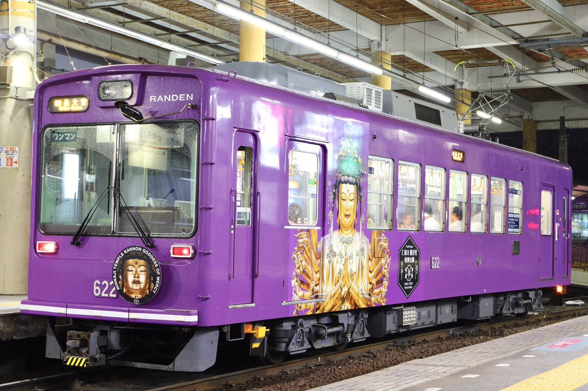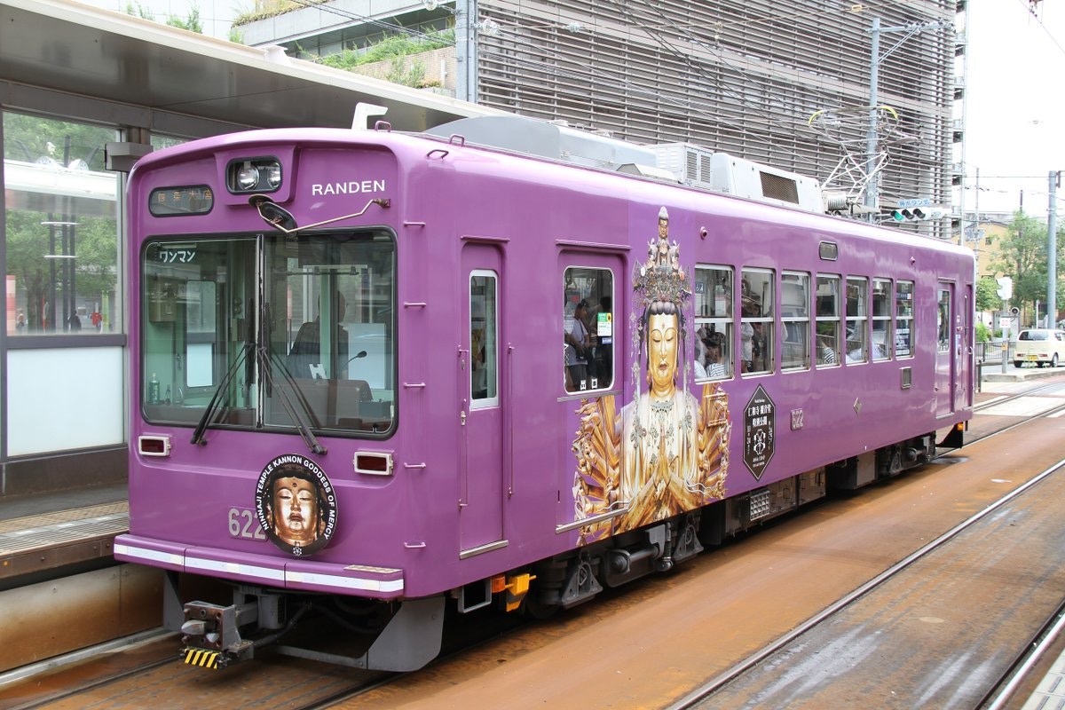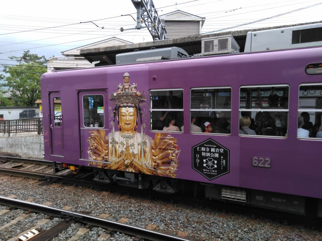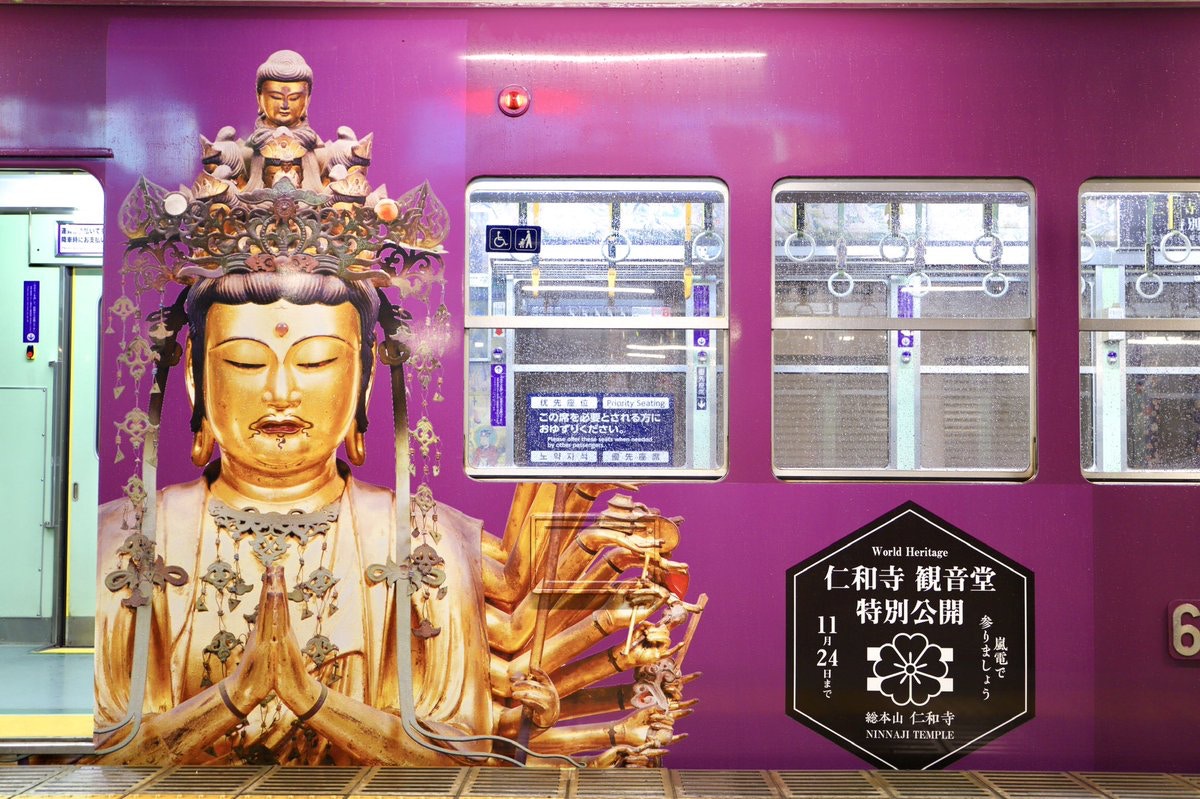 ▼原本不對外開放的「仁和寺觀音堂」,為了慶祝完成多年的維修,寺廟決定公開寺廟內的33座佛像以及375年前所留下的壁畫,當中也包括了千手觀音像的本尊在內!為了方便民眾到訪,寺廟才會聯同京都市觀光協會及JR西日本,將嵐電621形的622號列車進行改裝,讓更多人知道這件事。