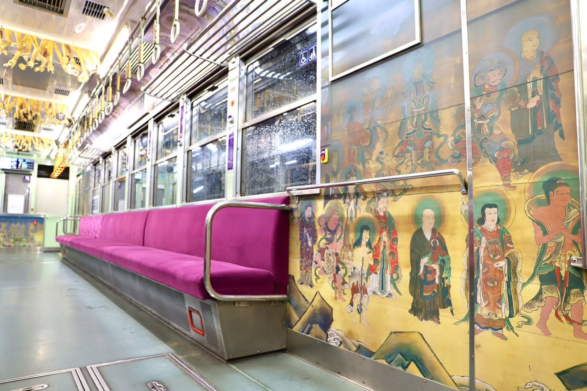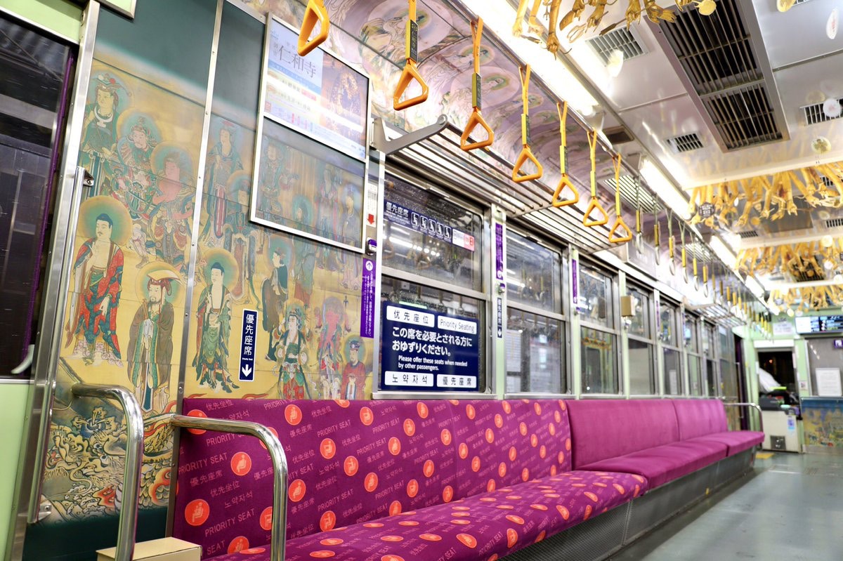 ▼「觀音電車」不僅在車頭、車身等外部畫滿了觀音畫像之外,就連內部裝潢也另有一番風味!
