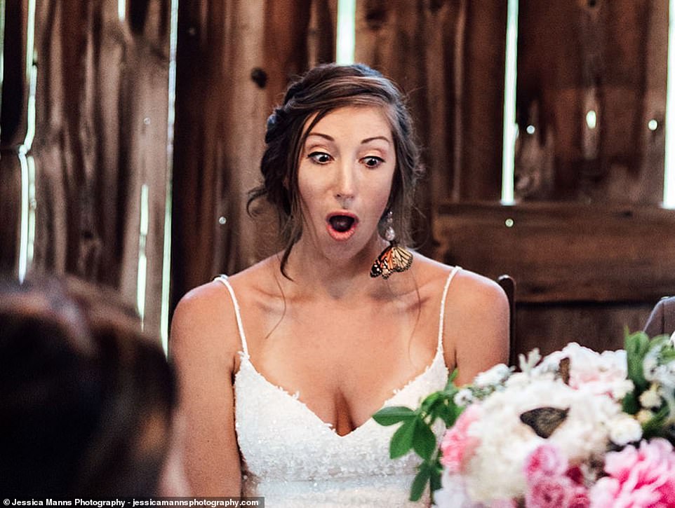 ▼一隻蝴蝶主動飛過來與新娘親近,她忍不住露出了驚喜的表情。