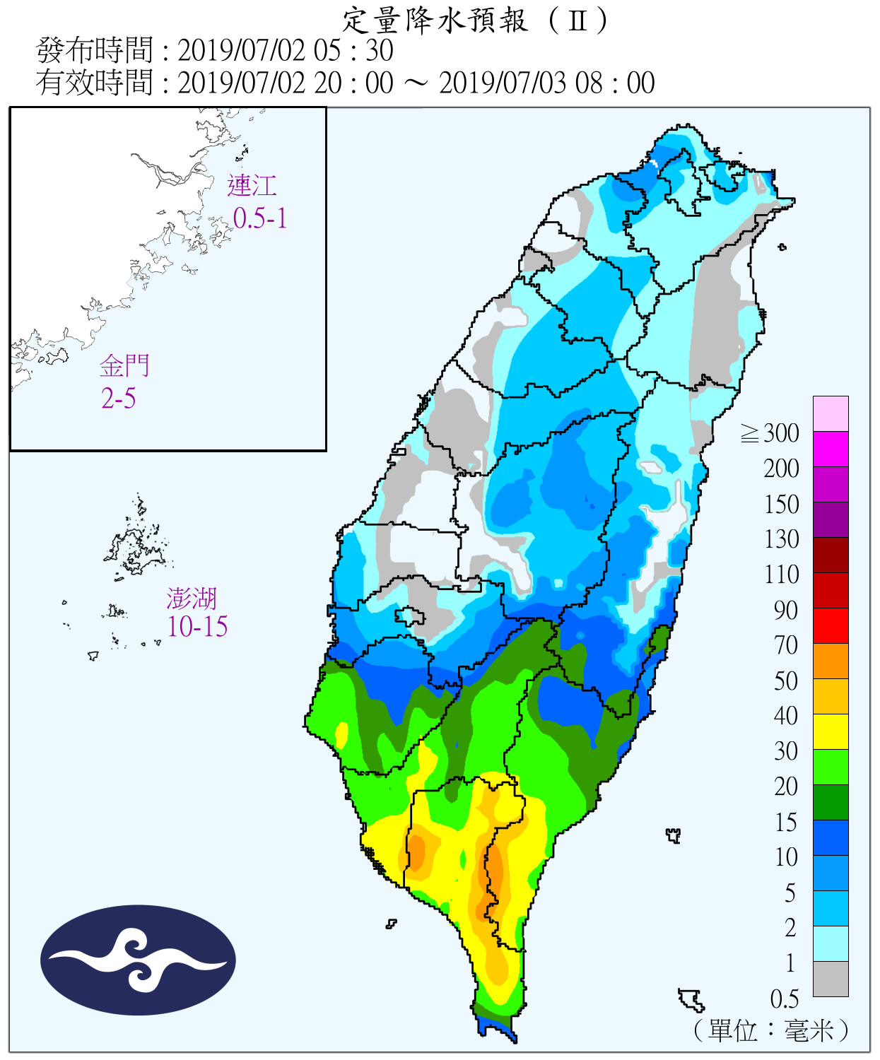 ▼氣象局也預測,7月2日晚上開始將全台有雨,狀況會維持到7月3日早晨8點。