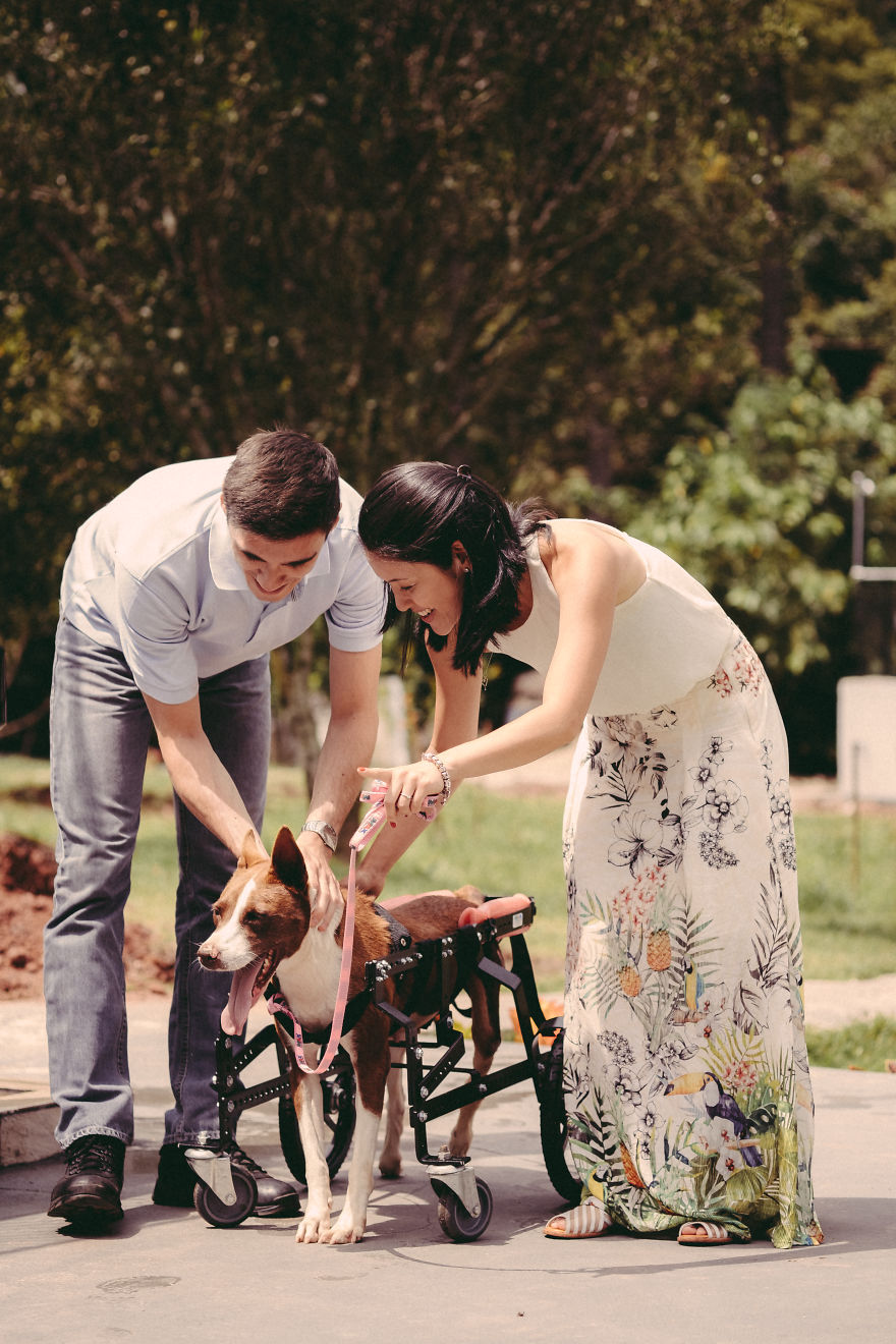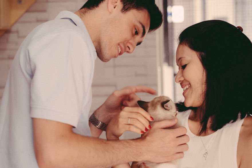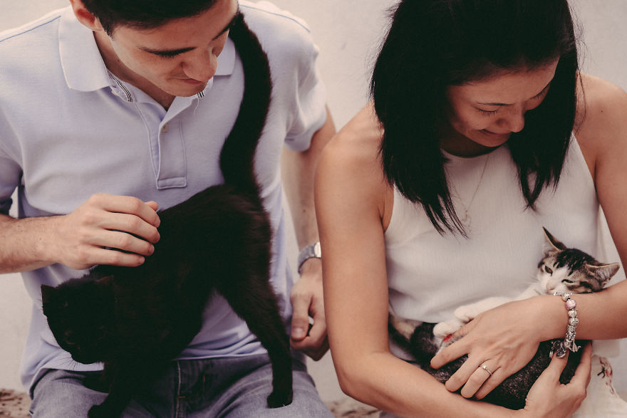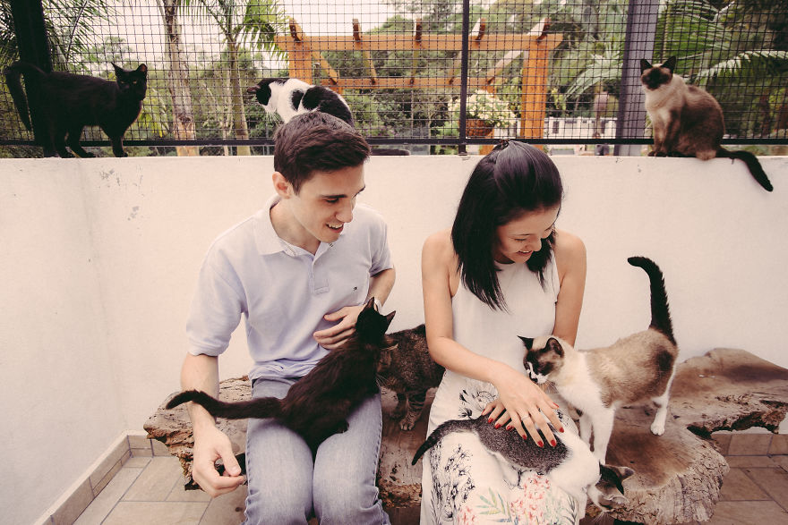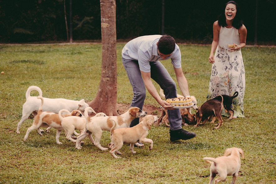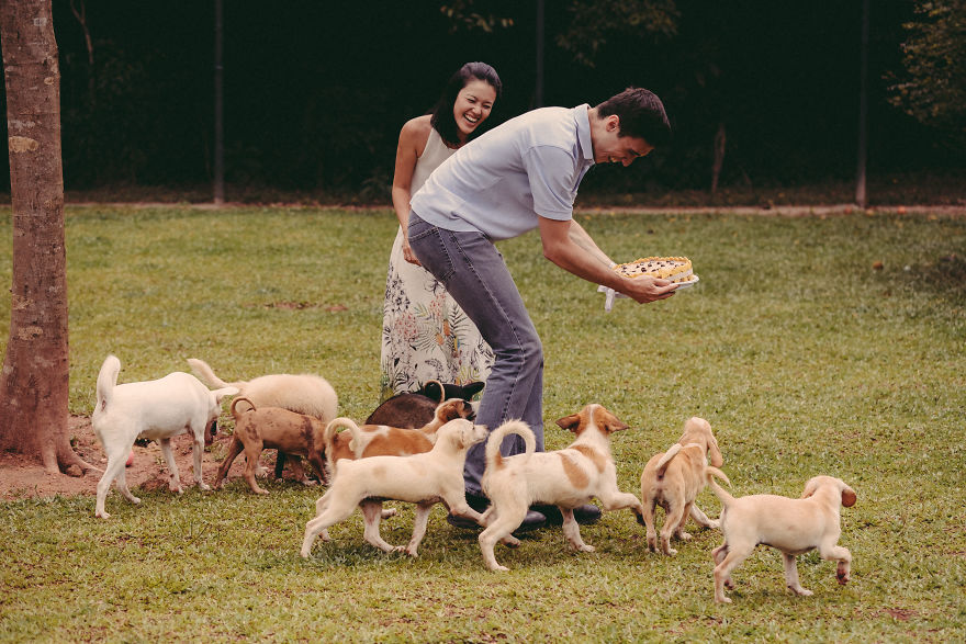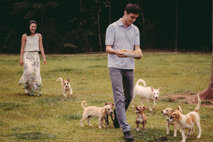 在西方國家的習俗當中,他們只有在婚禮當天才會穿上婚紗,因此他們除了婚禮當天的婚紗照以外,在結婚前還會先拍一些所謂的「訂婚照」。國外就有一對情侶因為很不喜歡擺出生硬的姿勢和動作來紀念這一天,於是想出了來到動物收容所,在動物們的圍繞下拍出最有愛的照片!